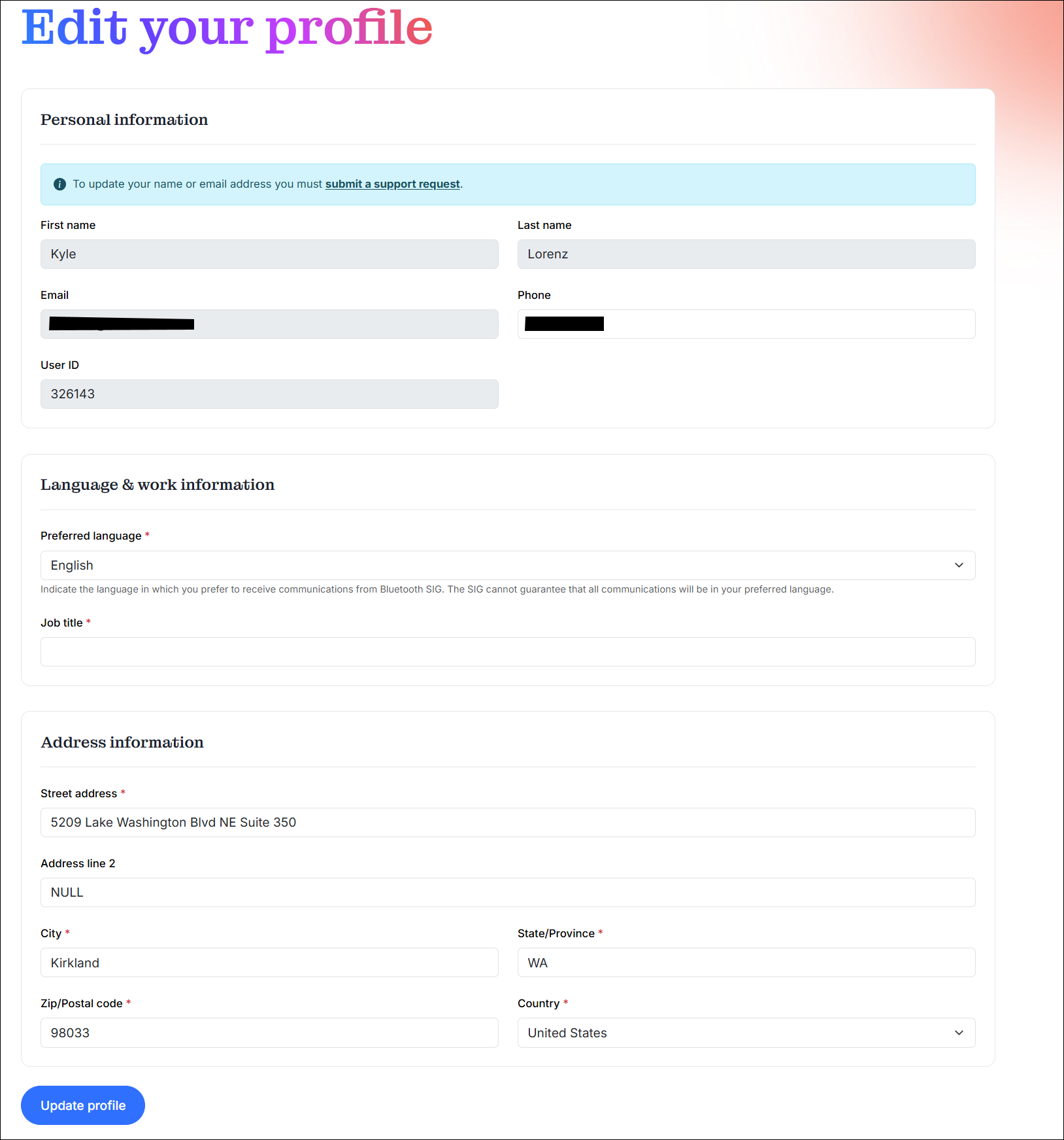Individual users can update the following fields from the ‘Edit Profile’ section