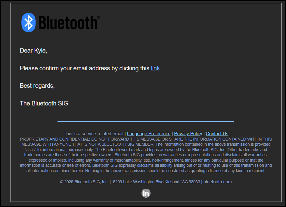 - See the article I cannot receive emails from the Bluetooth SIG to ensure email deliverability from the Bluetooth SIG.